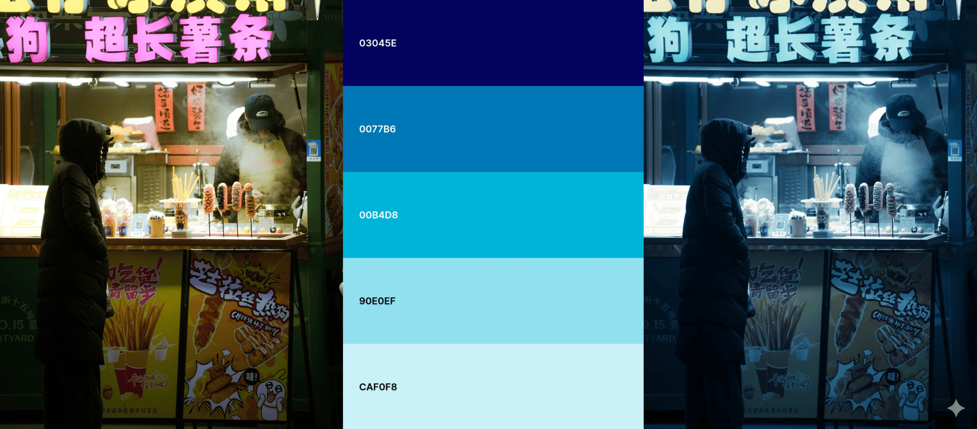 Prompt: change the colour grading of this image with these hex numbers: #03045E #0077B6 #00B4D8 #90E0EF #CAF0F8