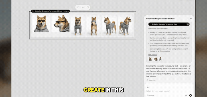 Start by defining your character and scene in a single prompt or reference image. From there, the agent can generate a sequence of variations, wide shots, close ups, and alternate camera angles while keeping the character consistent across each frame. Instead of prompting every shot manually, the agent handles the planning and generation across the scene.