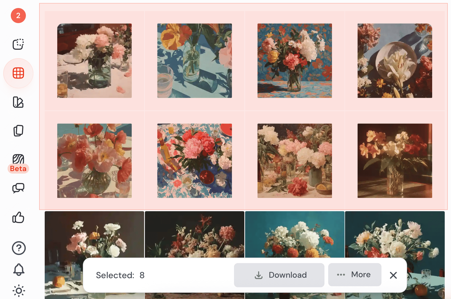 This is perfect when you are working through large batches of generations and need to collect selects quickly. No extra clicks, no opening image pages, just scan, choose, and save.